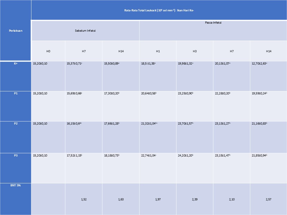 Aeromonas hydrophila bacteria can cause Motile Aeromonas Septicemia (MAS) disease in catfish. The use of phytopharmaceuticals is carried out as an alternative for disease control in catfish. One of the materials that can be used is the cinnamon leaf plant. This study aims to test the effectiveness of the use of cinnamon leaf extract through feed as a control of Motile Aeromonas Septicemia (MAS) disease in catfish (Clarias sp.). The feeding treatment was given 14 days before the challenge test and 14 days after the challenge test. This research was carried out at the Aquaculture Laboratory and Experimental Pond, Aquaculture Study Program and Laboratory of Microbiology and Biotechnology of Fishery Products, Fishery Product Technology Study Program, Department of Fisheries, Faculty of Agriculture, Sriwijaya University. This study used a Complete Randomized Design with 4 treatments and 3 replicates which included positive control (K+) without cinnamon leaf extract and infected with A. hydrophila, (P1) cinnamon leaf extract 0.25% in feed and infected with A. hydrophila, (P2) cinnamon leaf extract 0.5% in feed and infected with A. hydrophila and (P3) cinnamon leaf extract 0.75% in feed and infected with A. hydrophila. The results showed that cinnamon leaf extract at a dose of 0.75% in feed was the best treatment with 100% catfish survival, absolute length growth of 2.67 cm, absolute weight growth of 8.73 g, average percentage of fish recovered 100%, as well as total leukocytes, hemoglobin, and water quality within the normal range.